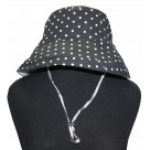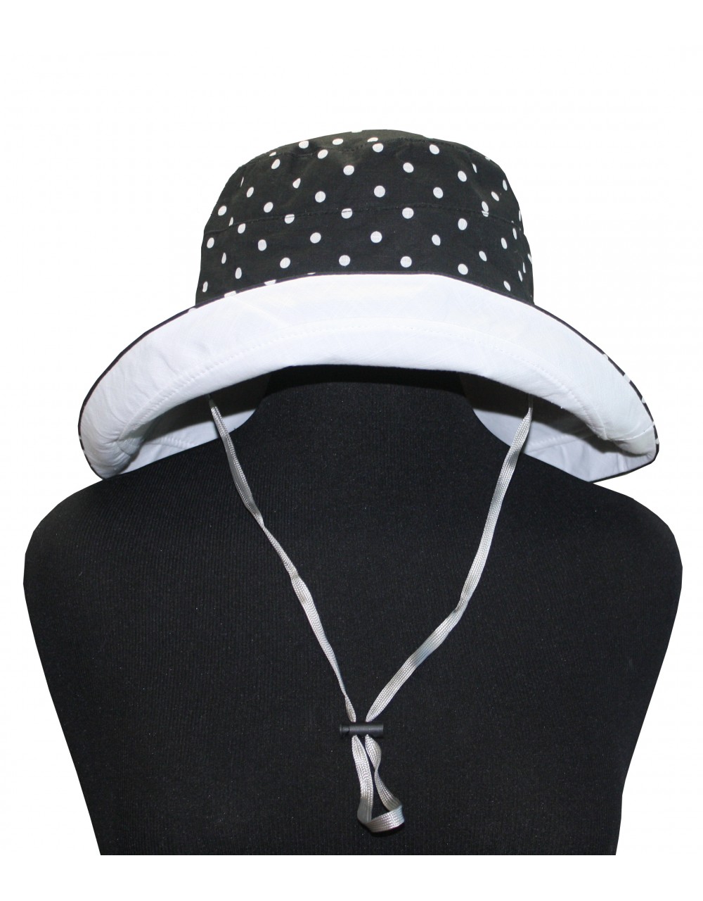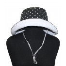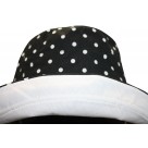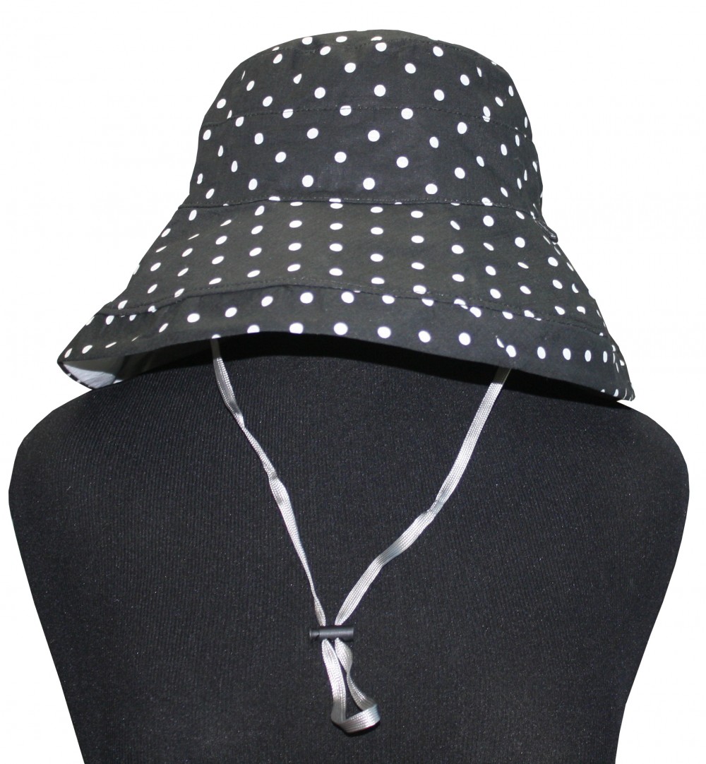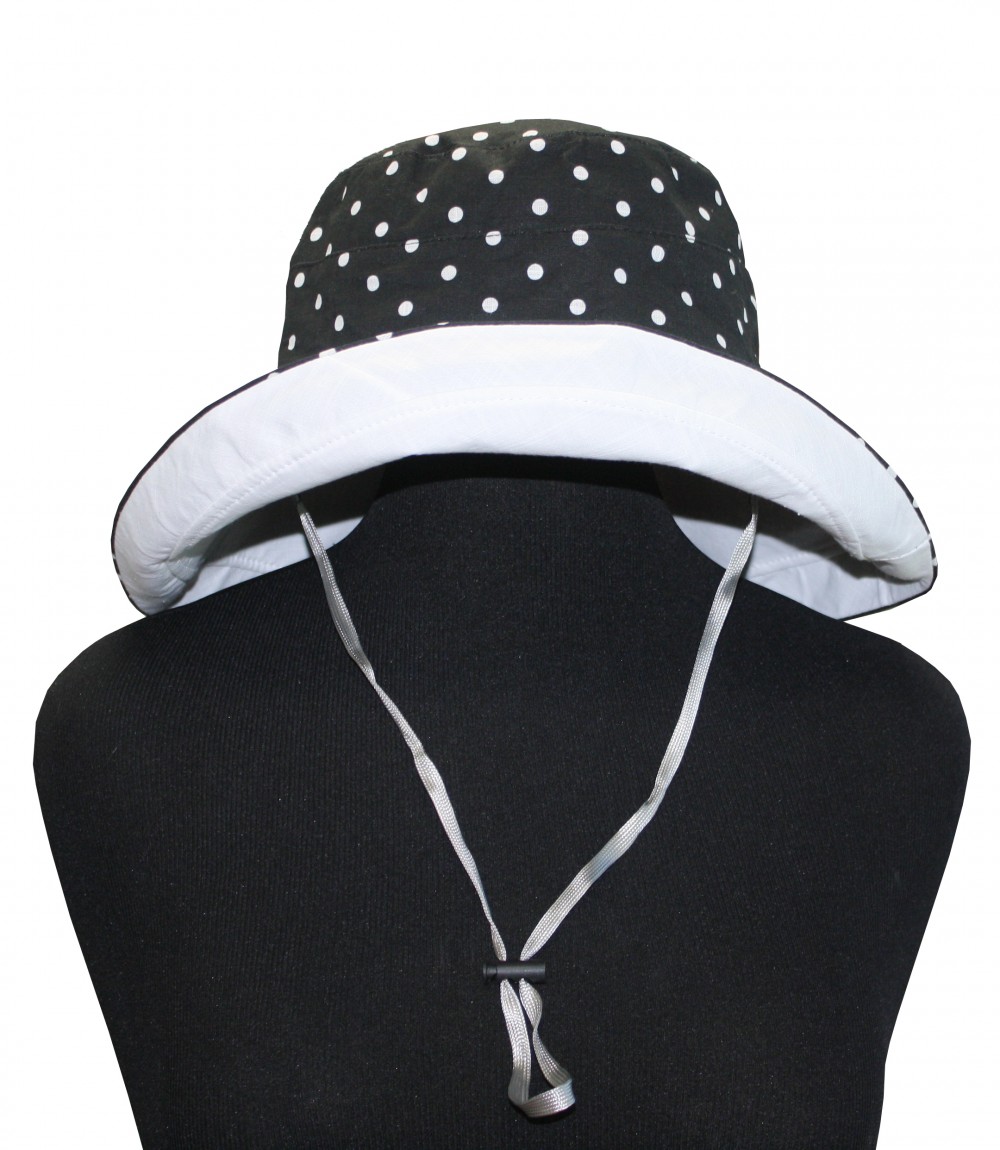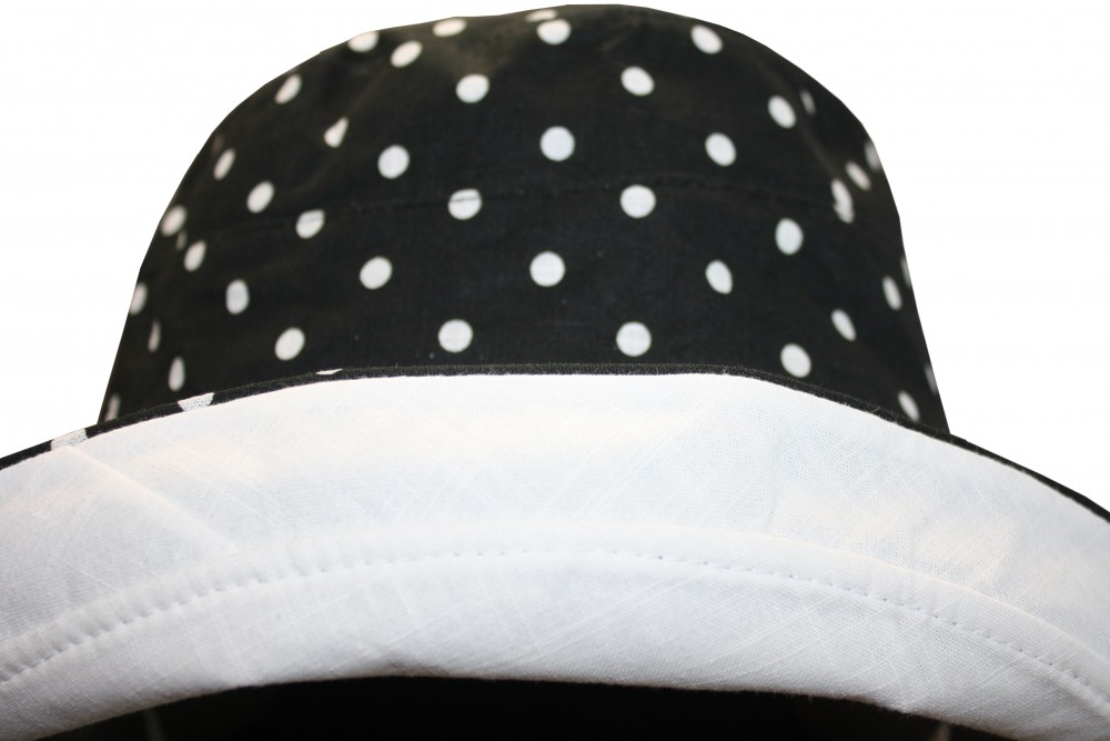 OUR WIDE AND LONG SUNBLOCKING BUCKET HAT IS GREAT FOR THOSE SUMMERY HOT SUNNY DAYS! THE BRIM IS LONG ENOUGH TO BLOCK THE SUN FROM YOUR ENTIRE HEAD/FACE. YOU ARE ALSO ABLE TO FLIP IT UP IF NEEDED/WANTED. THIS HAT IS REVERABLE TO MATCHING ALL YOUR OUTFITS! ONE SIDE IS BLACK WITH WHITE POLKA DOTS AND THE OTHER SIDE IS SOLID WHITE IT COMES WITH A CHIN STRAP FOR WINDY DAYS OR WHENEVER NEEDED.